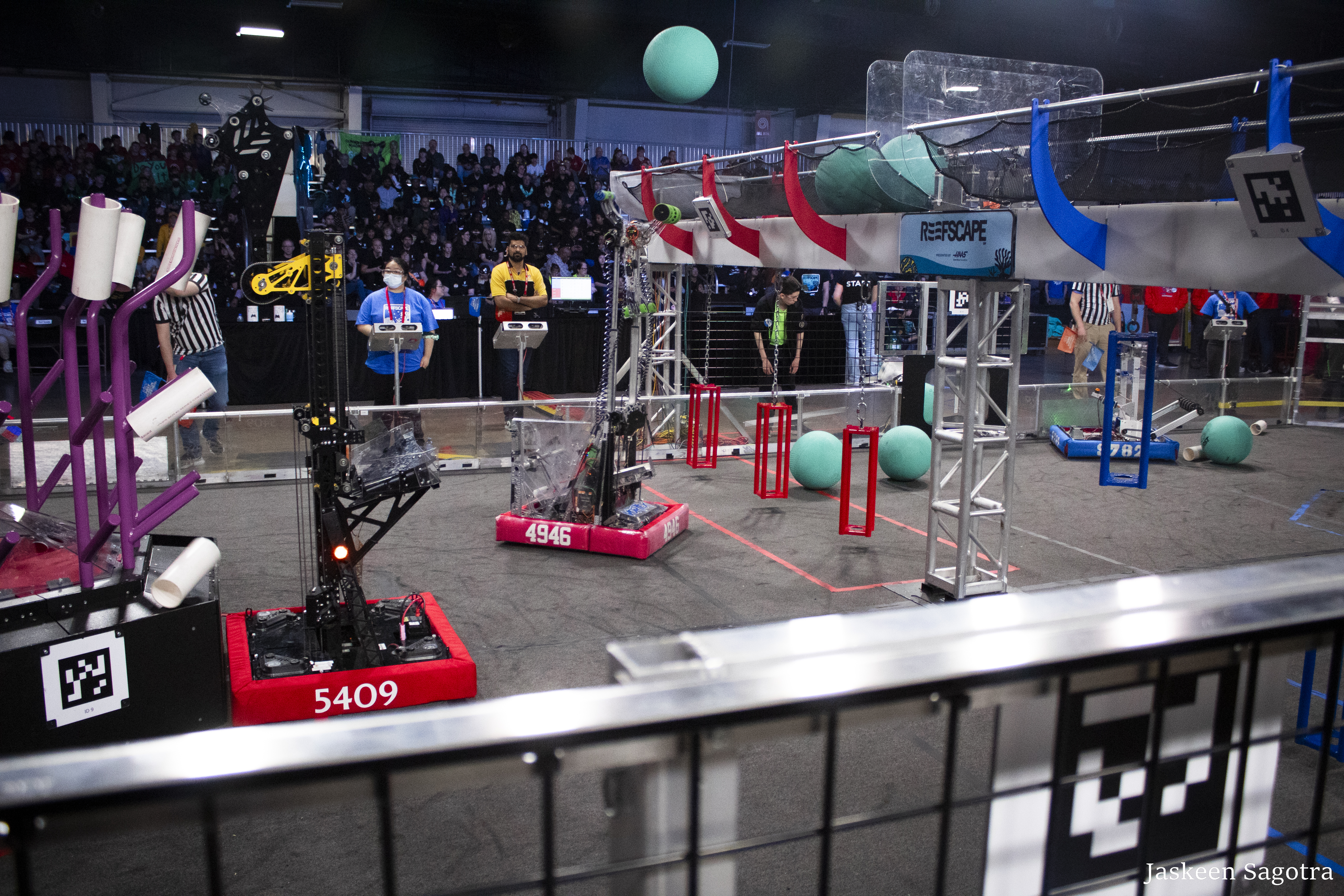 In Reefscape, teams collected coral from their loading stations and scored them on their reef. They also took algae from their reef and scored it in their net. At the end of the match, teams climbed on either a high or low cage.